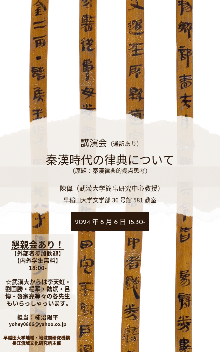 2024年8月6日(火)、武漢大学の陳偉先生をお迎えして、講演会「秦漢時代の律典について」(早稲田大学地域・地域間研究機構 長江流域文化研究所主催)が開催されます。学内外を問わず、是非皆さまお越しください。